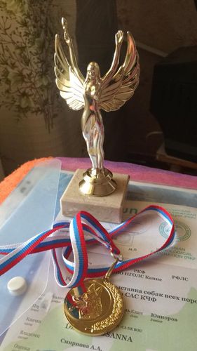 Tak wyglądają nasze trofea: piękne medale i obroże ufundowane przez organizatora.