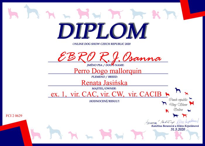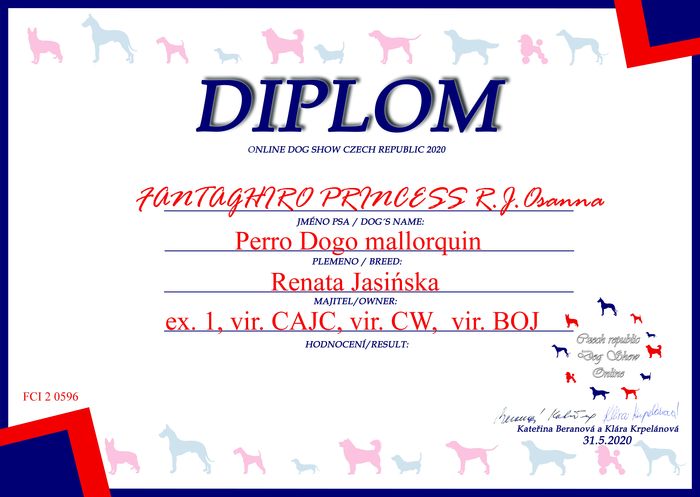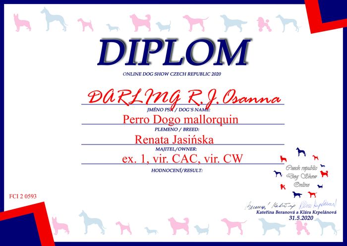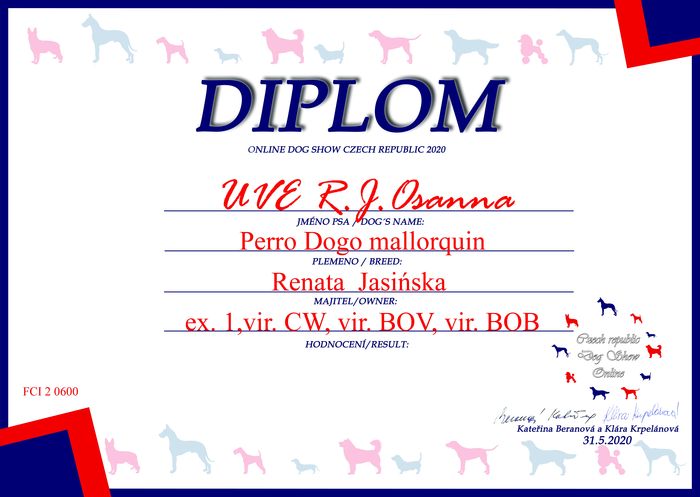 Zakończyła się ocena ras na kolejnej wystawie psów online, tym razem w Czechach. Organizatorzy postarali się, by wystawa miała "smak" prawdziwości i sędziowie przyznawali tytuły takie, jak na normalnej wystawie, ale z dopiskiem "vir" [ wirtualny tytuł ]. Tak więc przyznawano : vir CAC, res vir CAC, vir CACIB, res vir CACIB, vir CAJC, vir BOJ [ Best Junior ], vir BOV [ Best Veteran ], vir BOS i vir BOB.